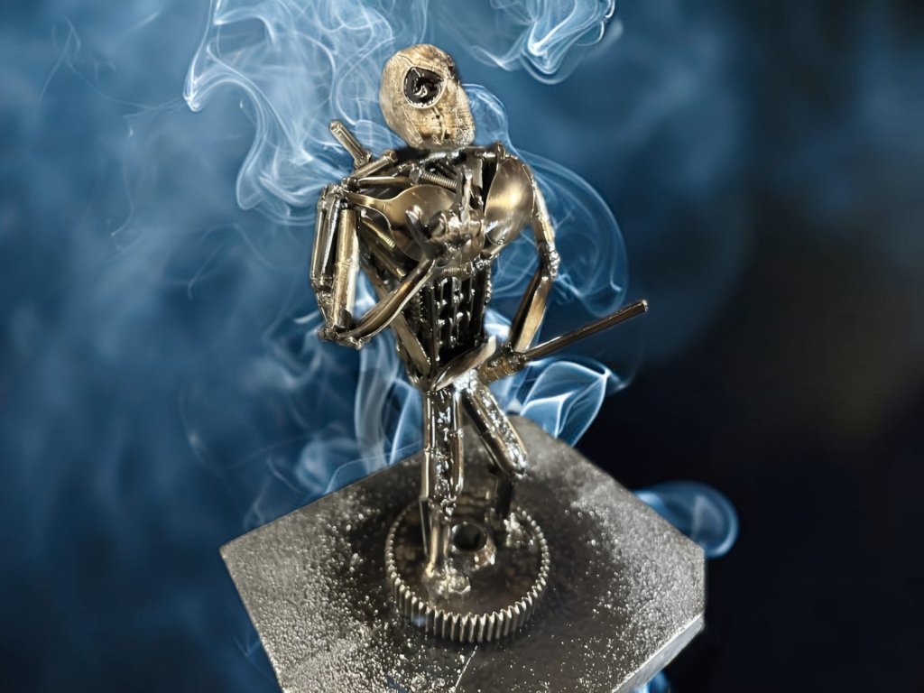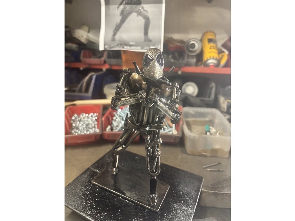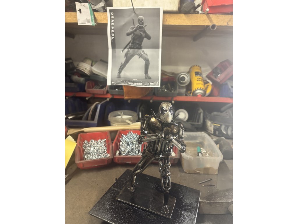 Deadpool z kovových materiálů a recyklovaných dílů s bezbarvou povrchovou úpravou.